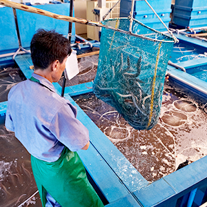- 그물망에 담아 봉한 후 진해물산(주) 활어차에 싣습니다.