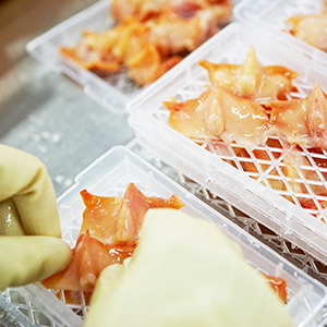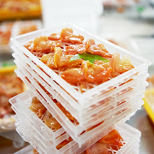 - 내장 및 이물질을 제거하여 세척 후 사이즈별로 트레이에 나열합니다.
