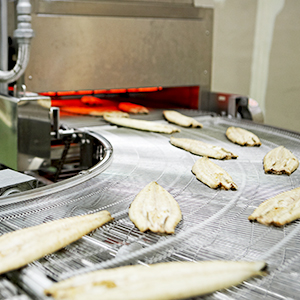 - 위생적으로 손질된 장어를 적외선구이로 2번에 걸쳐 자동반전장치를 이용 앞뒤로 구운 후 장어의 지느러미, 아가미, 가시 등을 제거합니다.